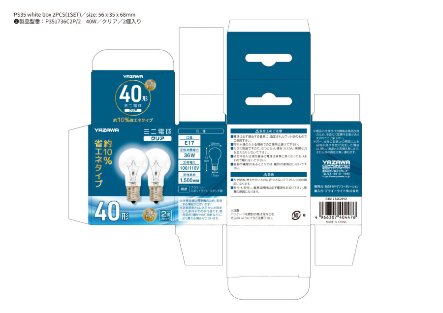 1. 誤購入を防ぐ徹底した「視認性」の確保 電球購入時に最も重要な「40形」「E17口金」「クリアタイプ」といった情報を、表面・側面の目立つ位置に配置。さらに「2個入り」や「約10%省エネタイプ」といった商品の特徴をアイコン化し、多種多様な商品が並ぶ売り場でも一目で中身が理解できる工夫を施しました。