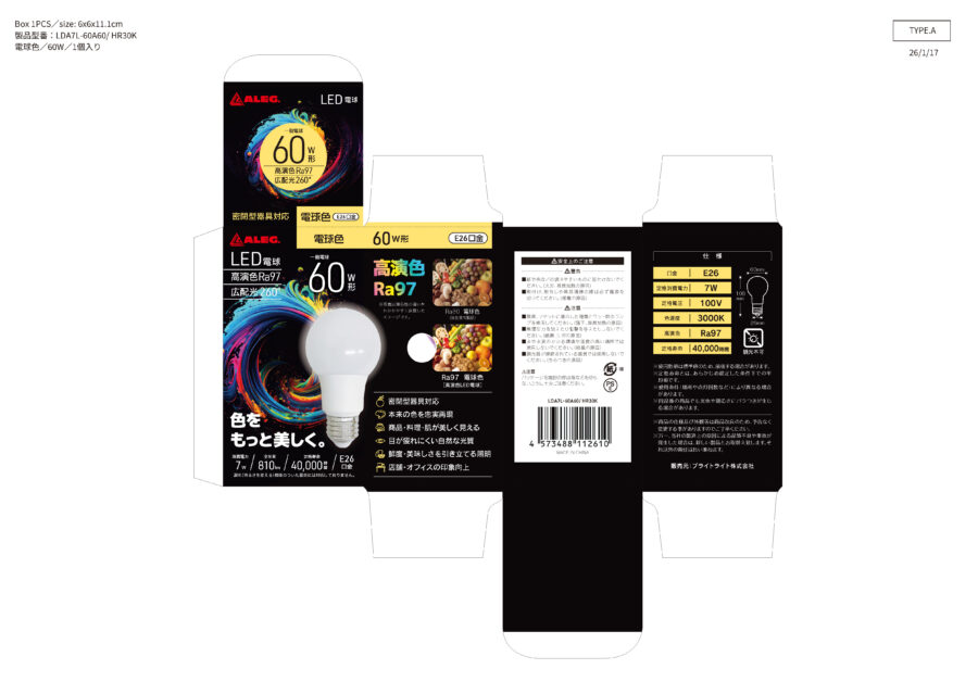 「高演色(Ra値が高い)」を売りにしたLED電球のパッケージデザインを、商品撮影からデザイン制作までワンストップで担当いたしました。