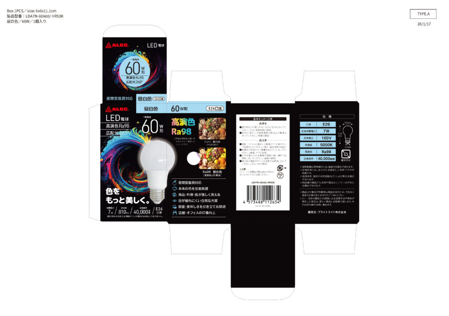 | 制作物 | 高演色LED電球 商品パッケージ(化粧箱) |