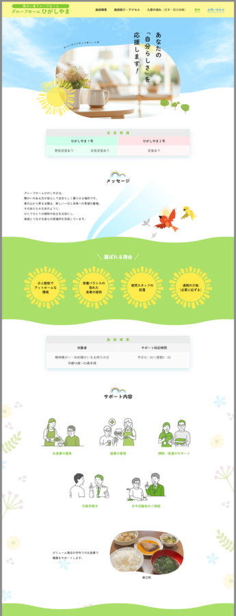 施設ごとの特徴や暮らしのイメージが直感的に伝わり、初めてグループホームを検討する方にもわかりやすいサイト構成に仕上げました。